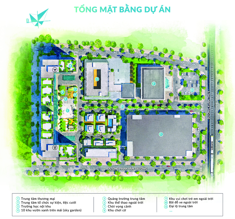Tổng diện khu đất: 41.567 m2, mật độ toàn khu 36,2%