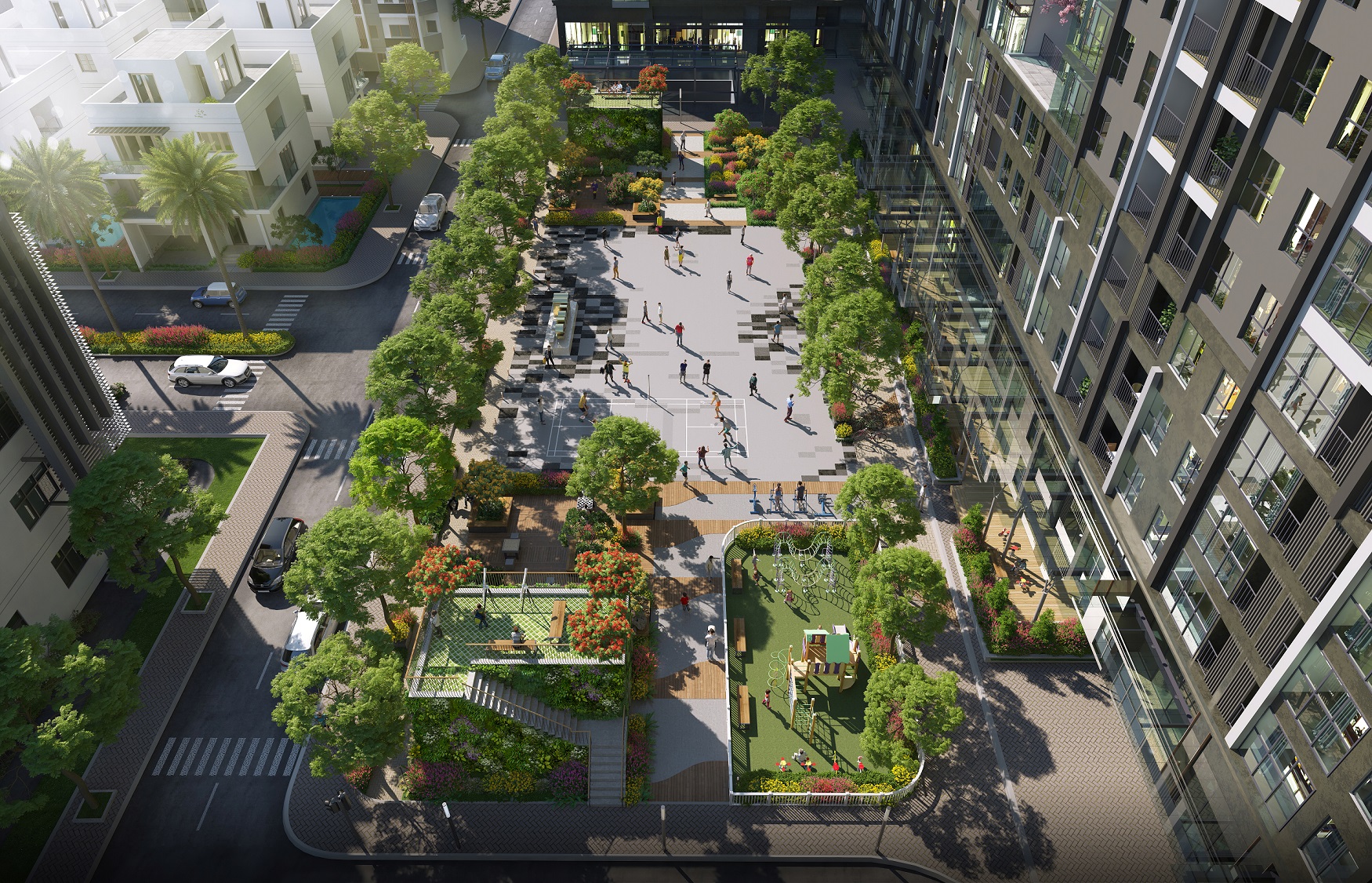Quảng trường trung tâm với không gian vui chơi trẻ em, người già, khu tập thể thao