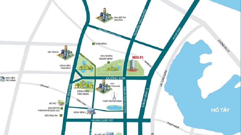 Dự án gần với Công viên Hòa Bình, Hồ Tây, KĐT Starlake, KĐT Ciputra và Siêu thị Metro trong bán kính chỉ 1-2 km. Hơn nữa, N03T1 chỉ cách Cầu Thăng Long và Cầu Nhật Tân 3km, thuận tiện kết nối giao thông ngoại tỉnh các tỉnh thành lân cận.