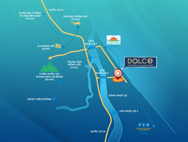 Dự án Dolce Penisola nằm tại xã Bảo Ninh, TP Đồng Hới. Dự án nằm bên dòng Nhật Lệ với những dải cát trắng, làn nước trong xanh, khí hậu lý tưởng, cùng mạng lưới kết nối hơn 50 điểm danh lam thắng cảnh du lịch nổi tiếng.