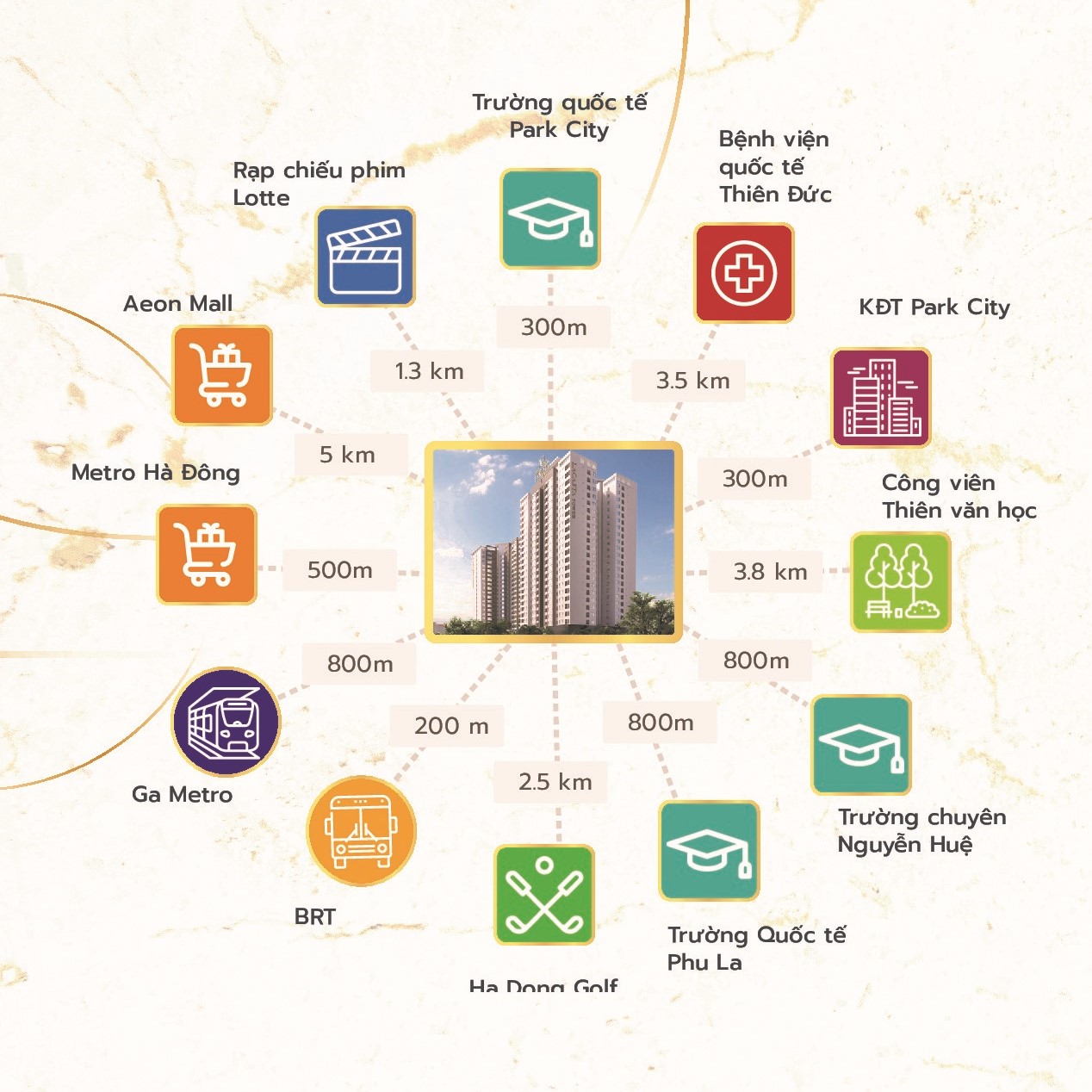 Dự án gần kề chuỗi các trường học liên cấp chất lượng cao như: Trường quốc tế Parkcity, hệ thống trường liên cấp Phú La, THPT chuyên Nguyễn Huệ...
