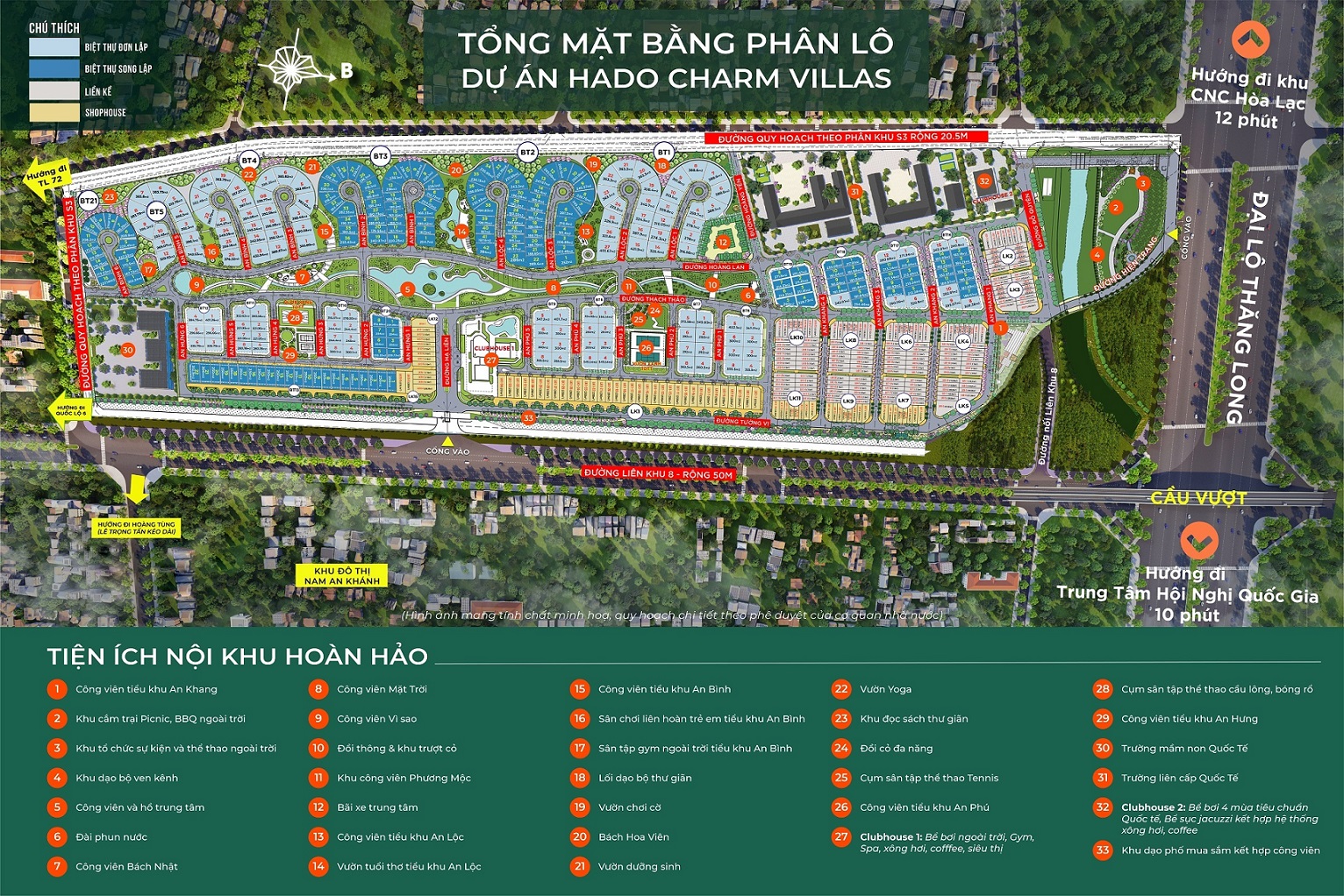Hado Charm Villas là Khu đô thị sinh thái đáng sống bậc nhất phía Tây Hà Nội do Tập đoàn Hà Đô làm chủ đầu tư. Dự án được thiết kế bởi Surbana International – đơn vị quy hoạch hàng đầu thế giới. Tiện nghi và đẳng cấp là 2 yếu tố bảo đảm sự biệt lập và riêng tư, kiến tạo không gian sống chuẩn quốc tế kết hợp với thiên nhiên và tiện ích mang phong cách hiện đại, gần gũi với thiên nhiên. Với mật độ xây dựng thấp bậc nhất Việt Nam theo mô hình khu nghỉ dưỡng (chỉ xây dựng chưa đến 18,1%), Hado Charm Villas sở hữu 2 hồ điều hòa cảnh quan lớn và hàng loạt mảng xanh rất hấp dẫn, trải dài hơn 20 công viên và vườn xanh, kiến tạo không gian sống xanh mát và thư thái.