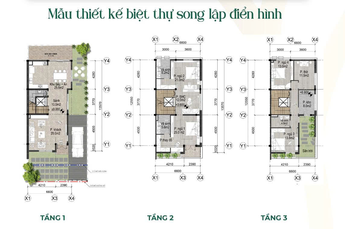 + Biệt thự song lập: 190 - 214 - 250m²