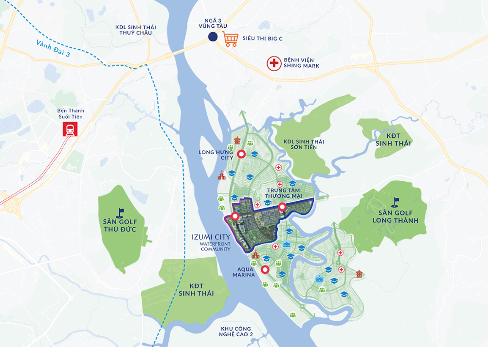 Với quy mô gần 170 hecta, tiếp giáp sông Đồng Nai và hai tuyến đường huyết mạch - Hương lộ 2 và Nam Cao, Izumi City khẳng định vị thế tâm điểm phồn vinh nơi cửa ngõ phía Đông Thành phố.