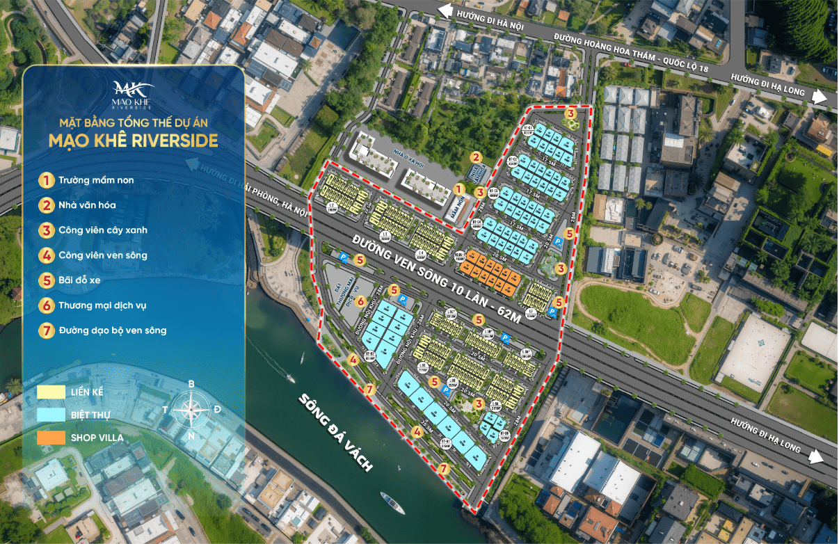 MẠO KHÊ RIVERSIDE tọa lạc vị trí đắc địa ở trung tâm phường Mạo Khê, tỉnh Quảng Ninh. Nổi bật với lợi thế ven sông Đá Vách vượng khí dồi dào, dự án nằm ngay giao điểm vàng của 2 trục giao thông chiến lược phía Tây Quảng Ninh là Quốc lộ 18 và tuyến đường ven sông rộng 10 làn dài gần 41km kết nối thông suốt từ cao tốc Hạ Long - Hải Phòng, đi qua dự án tại phường Mạo Khê và đến điểm cuối tại phường Đông Triều.