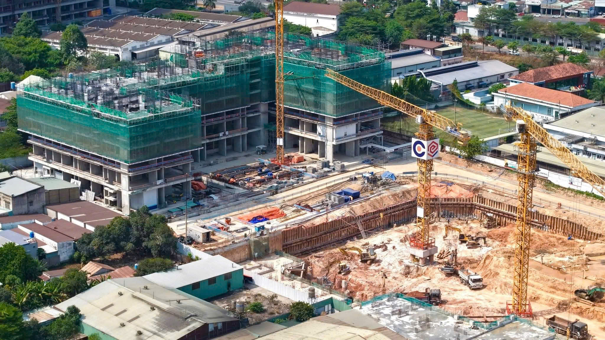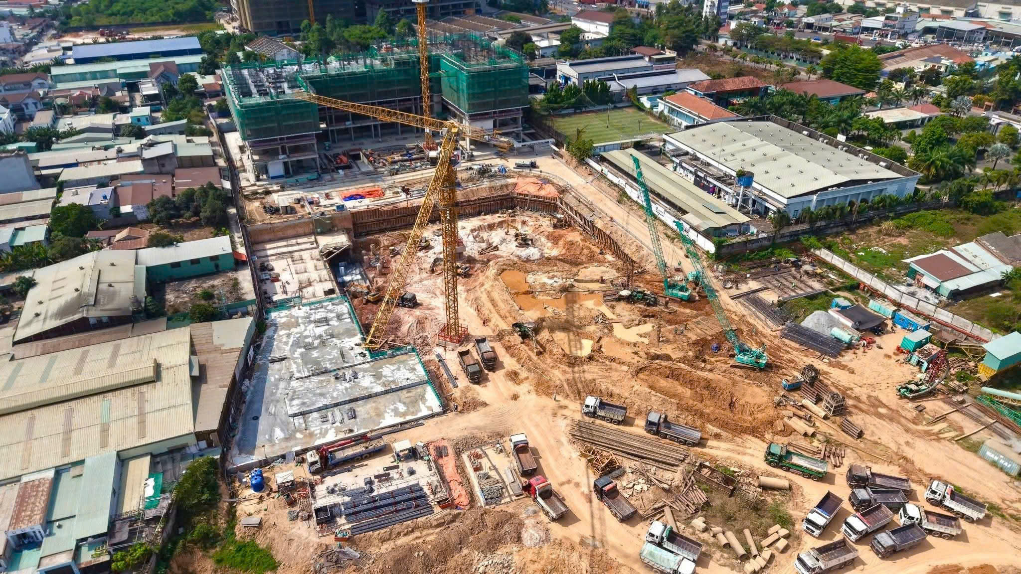 Hiện khối đế thương mại đã đạt khoảng tầng 4, đồng thời đang chuẩn bị triển khai cốp pha cho tầng tiếp theo. Không khí công trường ghi nhận liên tục hoạt động lắp dựng cốt thép, đổ bê tông và hoàn thiện kết cấu theo quy trình giám sát chặt chẽ, thể hiện nhịp thi công ổn định và bài bản.