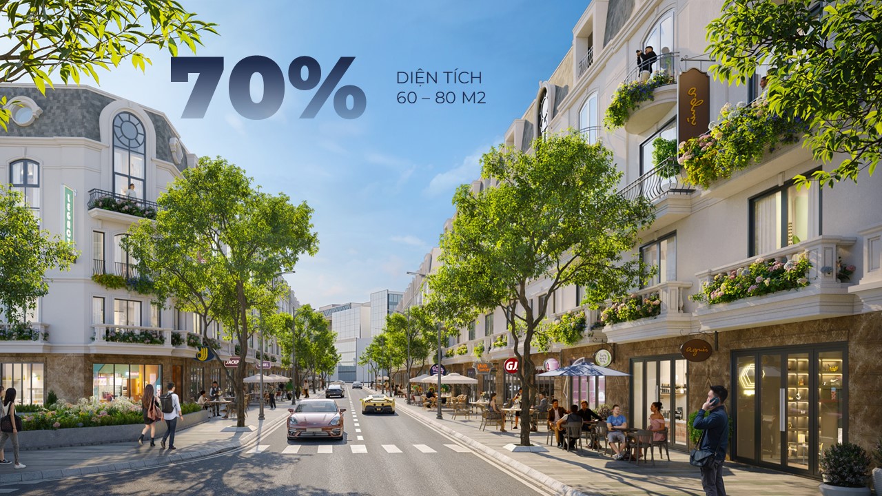 Nhà liền kề: Diện tích từ 60 – 90 m², mặt tiền 5 – 6m, cao 4 – 5 tầng, phù hợp cho các gia đình trẻ hoặc kinh doanh shophouse.
