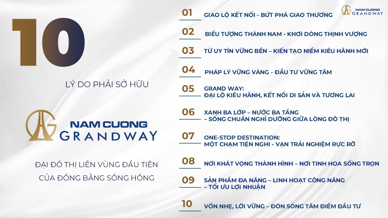 Nam Cường Grand Way là khu đô thị cao cấp tọa lạc tại lõi trung tâm TP Nam Định, được phát triển bởi Tập đoàn Nam Cường, một trong những nhà đầu tư uy tín hàng đầu tại Việt Nam. Dự án hội tụ những yếu tố đắt giá, kiến tạo nên không gian sống đẳng cấp, thượng lưu, đáp ứng nhu cầu ngày càng cao của giới tinh hoa