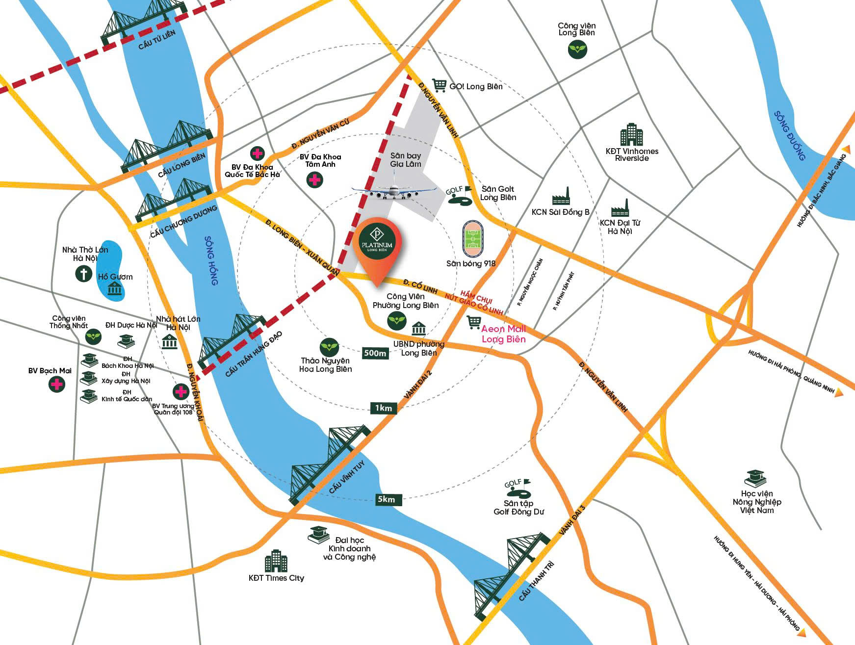 Ngoài ra, trong bán kính 1 km quanh Chung cư Platinum Cổ Linh Long Biên là hàng loạt các điểm giải trí hấp dẫn như trung tâm tâm thương mại Aeon Mall, sân golf Long Biên, Thảo Nguyên Hoa… Cư dân sẽ được thụ hưởng những dịch vụ/trải nghiệm đỉnh cao “có một không hai” chỉ với 5 – 10 phút di chuyển.