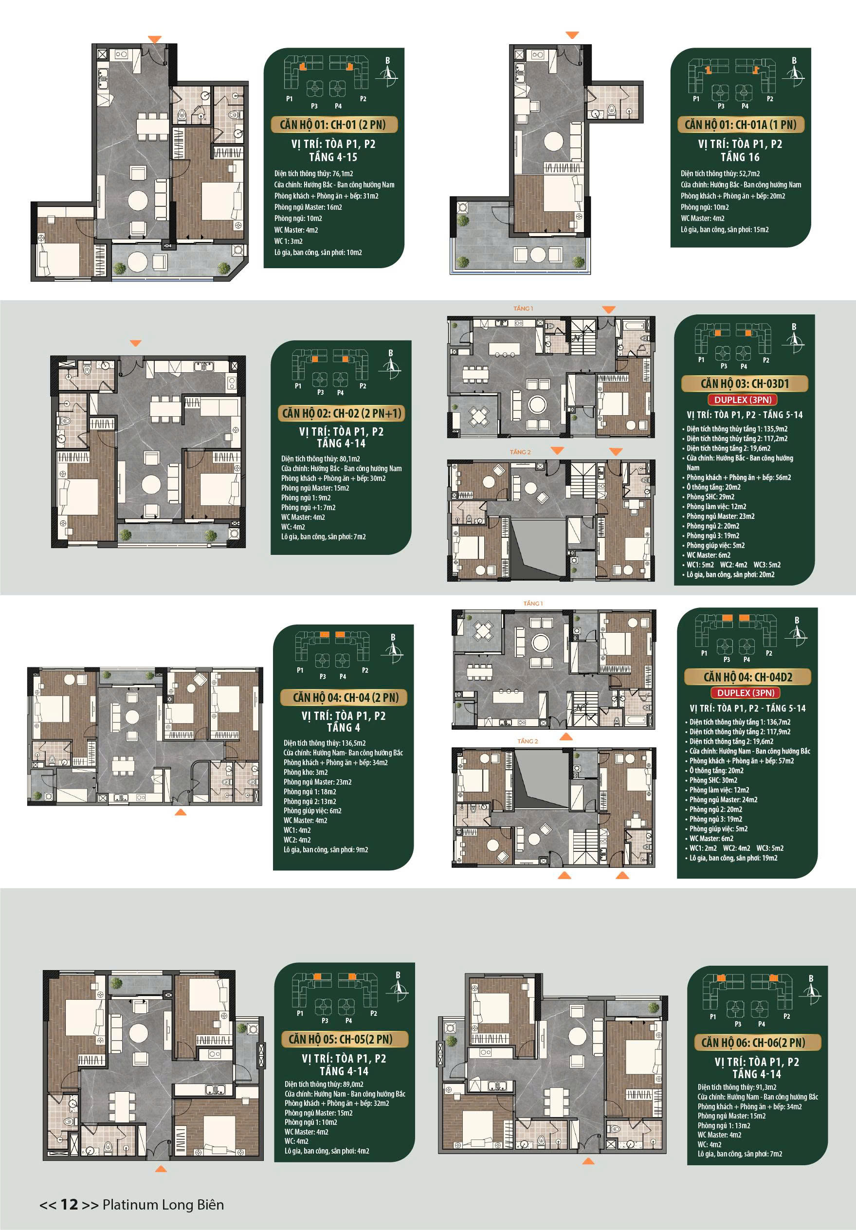 Các căn hộ Platinum Cổ Linh Long Biên được thiết kế với diện tích từ 48 – 112 m2, chia thành nhiều loại hình đa dạng: 1PN+1, 2PN, 3PN, 4PN. Được thiết kế theo tiêu chuẩn, 100% phòng khách, phòng ngủ căn hộ đều sở hữu ban công/cửa sổ rộng lớn, vô cùng thoáng đãng. Đặc biệt, một số căn hộ còn sở hữu thêm không gian đa năng + 1, chủ sở hữu có thể dễ dàng thiết kế thành phòng làm việc, phòng ngủ nhỏ, nhà kho… vô cùng tiện lợi.