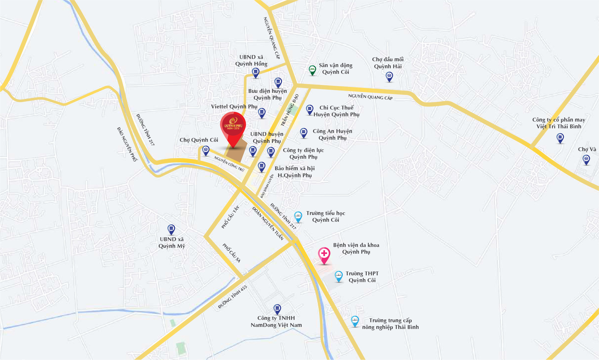 Dự án Quỳnh Phụ New City nằm sát trung tâm thị trấn Quỳnh Côi và ngay cạnh chợ Quỳnh Côi có diện tích hơn 2,6ha: Quy mô 780 gian hàng gồm 8 khu ki ốt kinh doanh tổng hợp, 25 khu kinh doanh chuyên ngành gia dụng, mỹ phẩm, nông sản, thực phẩm, khu ăn uống, tạp hóa và phụ trợ công việc.