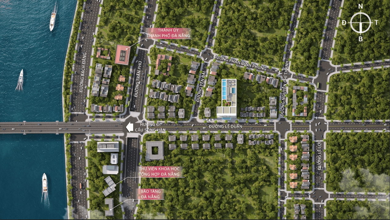 Chỉ cách cầu Sông Hàn 300m – Cây cầu đầu tiên bắc qua Sông Hàn, dự án là trái tim kết nối giao thương đôi bờ sông, liền kề hai trục đường sôi động nhất thành phố – Bạch Đằng và Trần Hưng Đạo.
