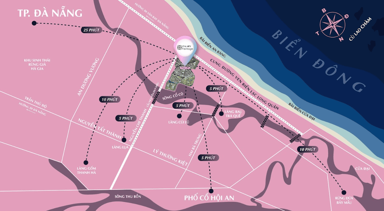 Vị trí The An Heritage thừa hưởng lợi thế thiên nhiên ưu đãi – “cận biển, kề sông”, nằm giữa 2 dòng nước, khi cách bãi biển An Bàng – top 50 bãi biển đẹp nhất thế giới chỉ 200m và giáp sông Cổ Cò trong xanh với không gian yên bình, thơ mộng. Điều này mang lại nguồn phong thủy rất tốt, giúp tăng khả năng thanh lọc không khí, giảm tiếng ồn khói bụi, mang đến rất nhiều lợi ích cho sức khỏe, tinh thần cho gia chủ.