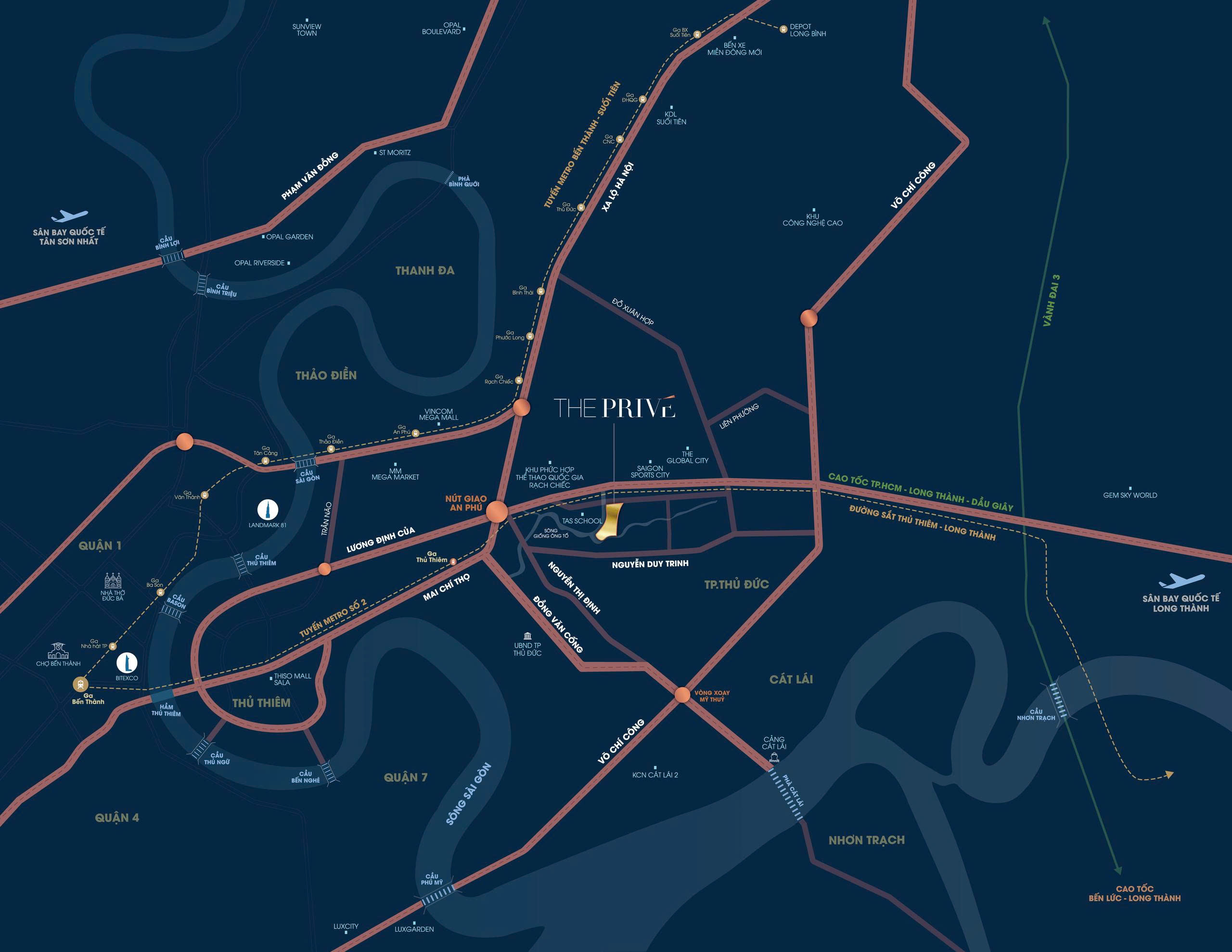 Tọa lạc tại vị trí đắc địa bậc nhất khu Đông Sài Gòn, The Privé là điểm giao thoa của các trục đường huyết mạch. Dự án tích hợp tiện ích kết nối đa chiều thông qua hệ thống giao thông hiện đại, cho phép cư dân dễ dàng tiếp cận mọi tiện ích của thành phố.