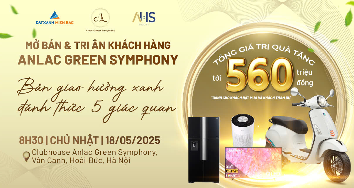 Sáng Chủ nhật, ngày 18/05/2025 tới đây, tại Clubhouse - Khu đô thị Anlac Green Symphony sẽ diễn ra sự kiện mở bán và tri ân khách hàng với chủ đề “Anlac Green Symphony: Bản giao hưởng xanh đánh thức 5 giác quan”. Tại sự kiện, các khách hàng tinh hoa sẽ được trải nghiệm không gian sống xanh đẳng cấp tại khu đô thị đồng thời có cơ hội nhận những phần quà hấp dẫn với tổng giá trị quà tặng lên tới 560 triệu đồng.