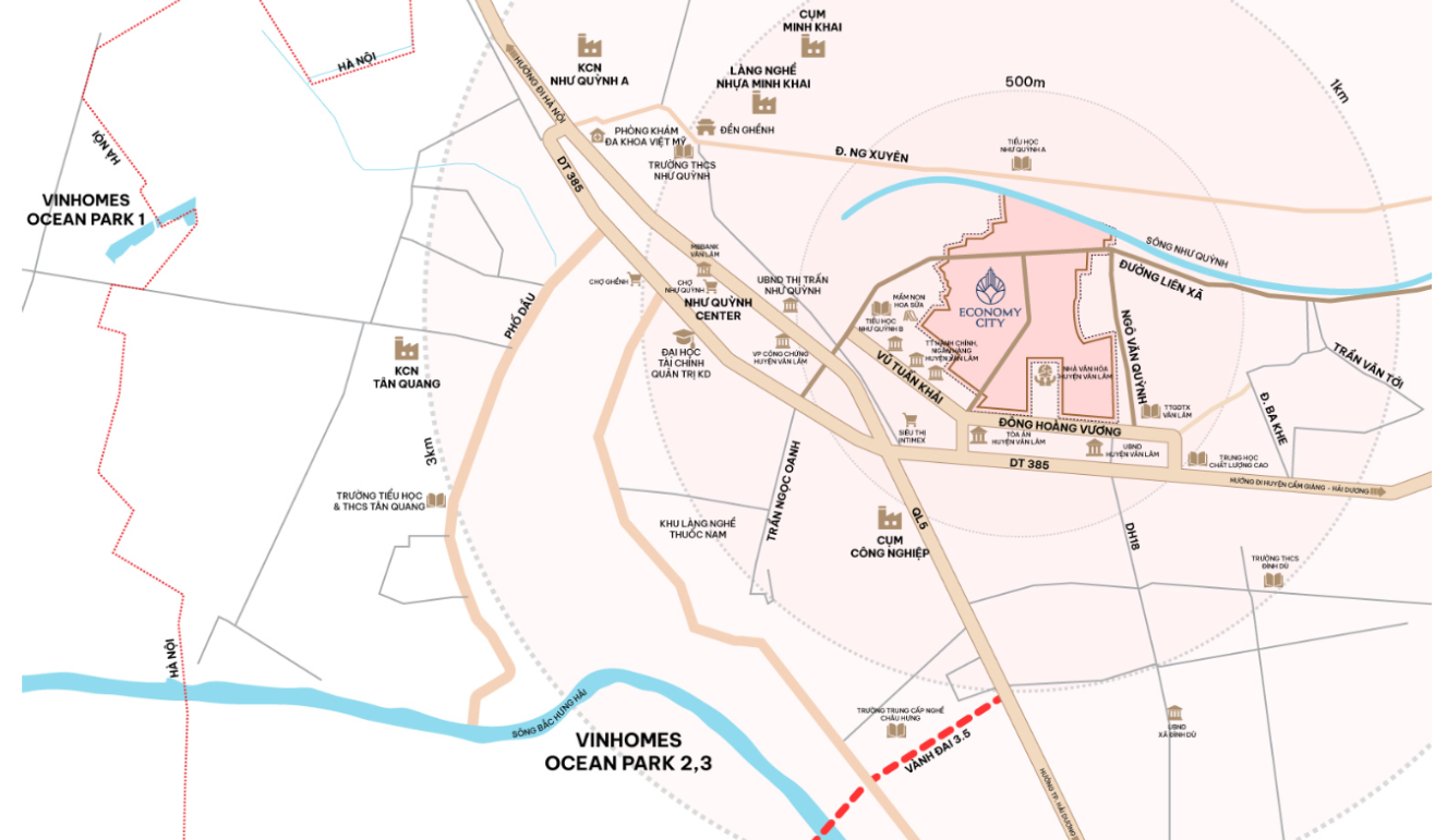 Economy City tọa lạc tại lõi đô thị trung tâm thị trấn Như Quỳnh, Văn Lâm, Hưng Yên, cửa ngõ phía Đông của Thủ đô Hà Nội. Đây là khu vực được quy hoạch trở thành một trong những động lực phát triển đô thị, công nghiệp và dịch vụ của vùng Thủ đô trong giai đoạn 2025 – 2035.