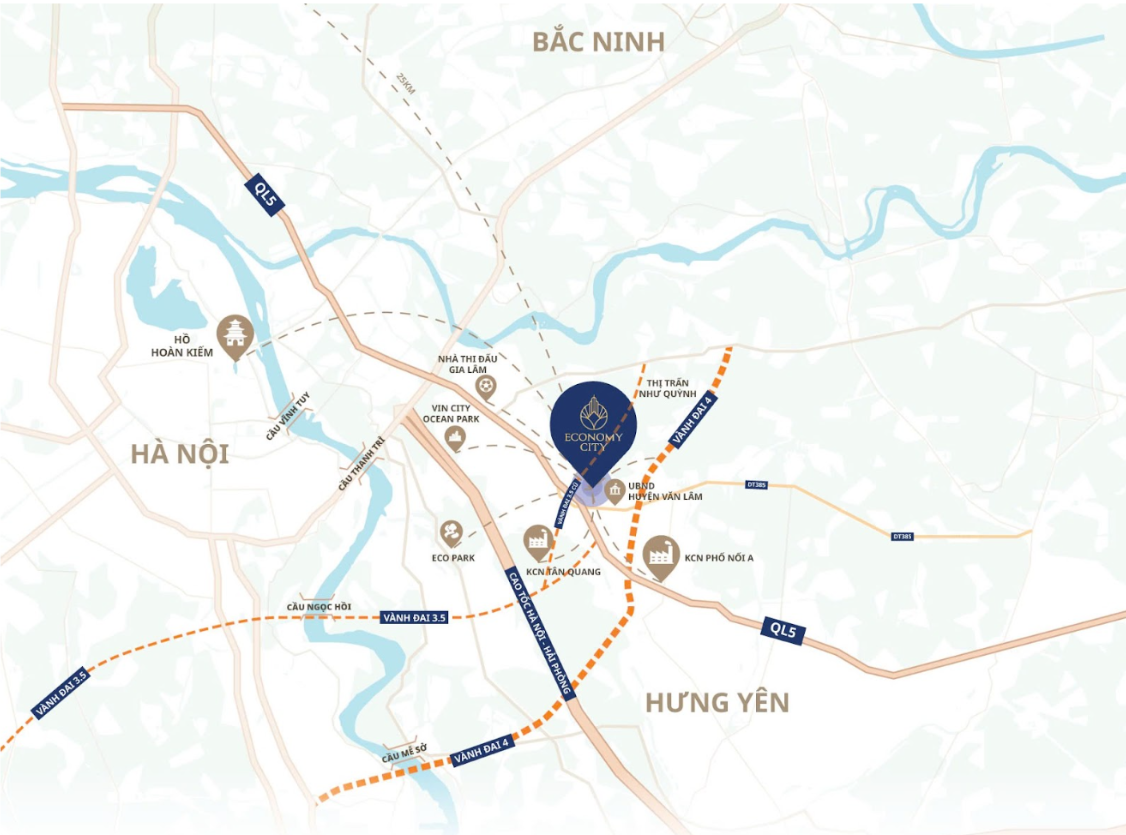 Từ Economy City di chuyển tới trung tâm Hà Nội chỉ 18 phút di chuyển, kết nối các trục giao thông huyết mạch như Quốc lộ 5A, ĐT.385, đường 281, Vành đai 3.5 và chỉ cách Vành đai 4 khoảng 2km, điều này tạo lợi thế giao thương cho dự án dễ dàng tiếp cận các khu công nghiệp trọng điểm và các trục kinh tế lớn của miền Bắc.