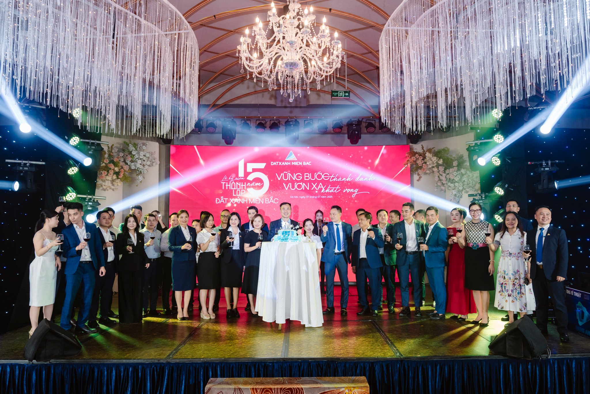 Đến với khoảnh khắc ý nghĩa nhất sự kiện, hòa chung không khí trang trọng của buổi lễ, toàn thể khán phòng cùng Ban Lãnh đạo thực hiện nghi thức thổi nến, cắt bánh sinh nhật và nâng ly chúc mừng - đánh dấu cột mốc 15 năm hình thành, kiên cường vượt sóng và không ngừng vươn mình phát triển của Đất Xanh Miền Bắc.