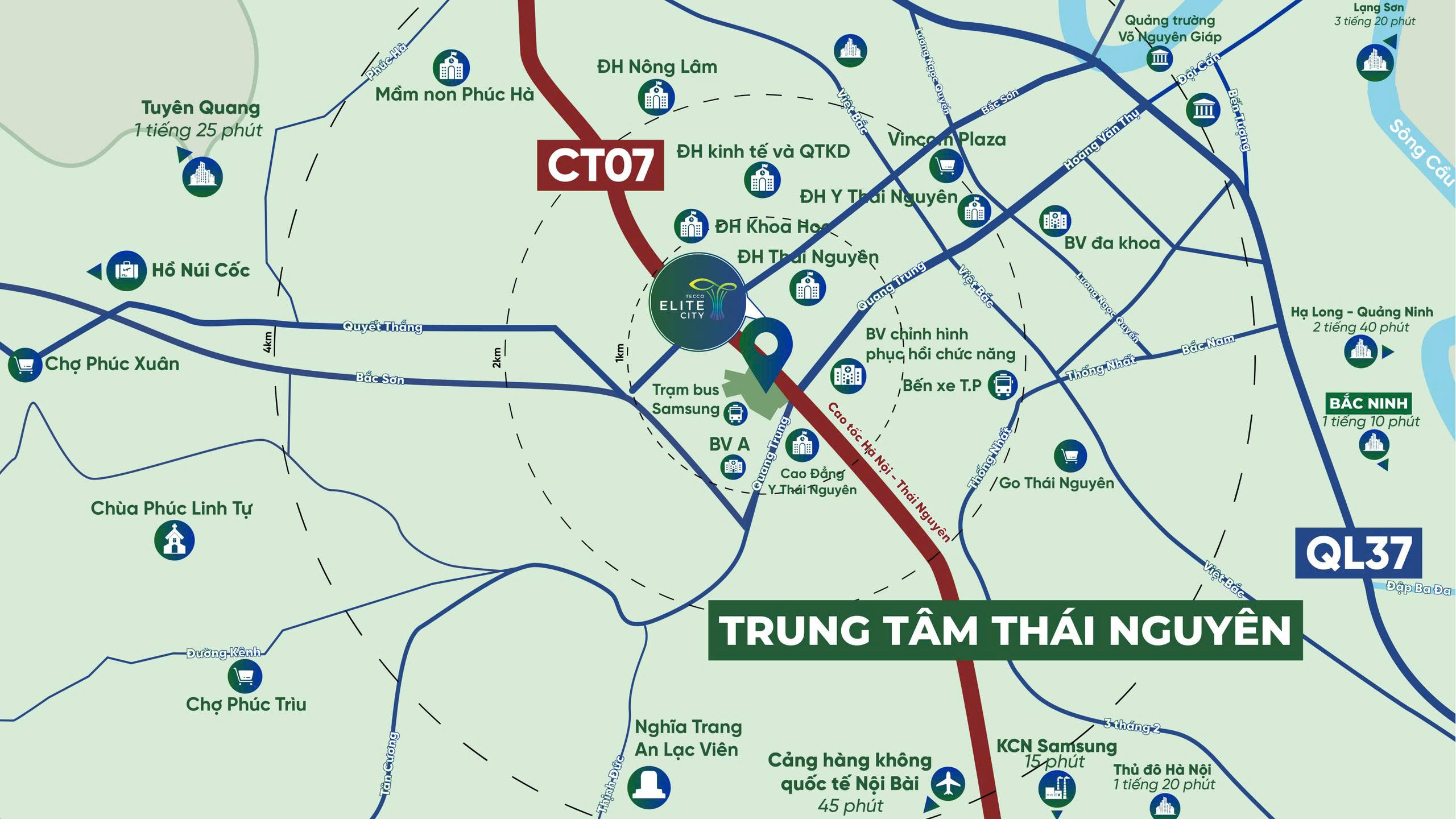 Theo đó, Tổ hợp căn hộ cao cấp Tecco Elite City nằm ngay giao lộ cao tốc Hà Nội – Thái Nguyên và trục đường huyết mạch Quang Trung – Bắc Sơn, trong khu vực được quy hoạch là trung tâm phát triển đô thị mới của tỉnh Thái Nguyên. Trong khi khu vực trung tâm cũ quanh Hoàng Văn Thụ, Lương Ngọc Quyến đã bão hòa cả về quỹ đất lẫn hạ tầng thì khu vực này sẽ có dư địa phát triển vượt trội trong tương lai gần bởi các lý do: hạ tầng giao thông đồng bộ, quy hoạch hiện đại và tiềm năng hút đầu tư. Chính sự dịch chuyển này đã đưa Tecco Elite City trở thành tâm điểm đầu tư giữa trung tâm đô thị mới của Thái Nguyên.