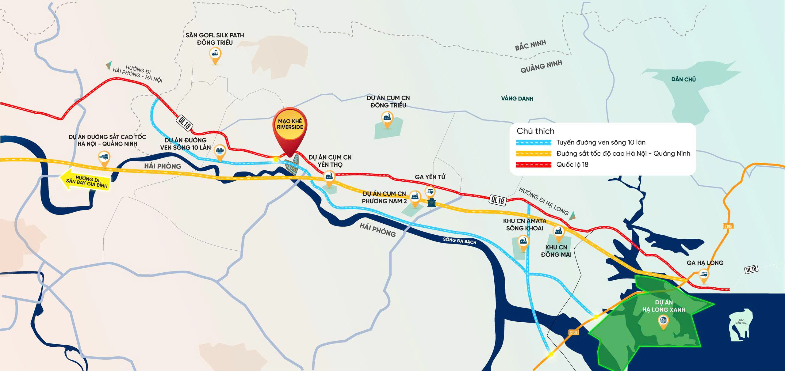 Mạo Khê Riverside nằm ngay điểm giao thoa chiến lược Quốc lộ 18 và tuyến đường ven sông